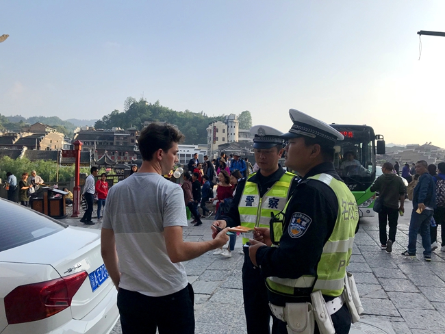 5月2日下午,一名外国友人在镇远步行街入口发生交通摩擦,在此站岗执勤的镇远交警大队长张彤彤立即上前,文明规范处置,妥善解决纠纷,受到当事双方赞扬。